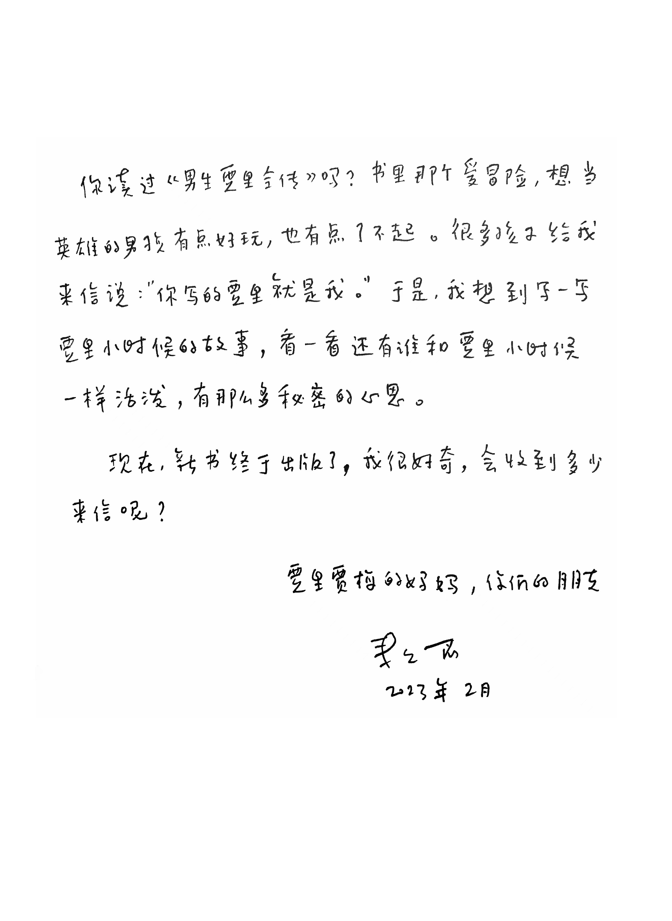 以信為名,由信傳遞。是信把這位大作家和全世界喜愛她的小讀者們緊緊聯系在一起。讀完《男生賈里》后,很多孩子給秦文君來信說:“你寫的賈里就是我?!爆F在,小時候的故事出版了,秦老師也好奇地想知道還有誰和賈里小時候一樣活潑,有那么多秘密的心思,期待收到更多的來信。