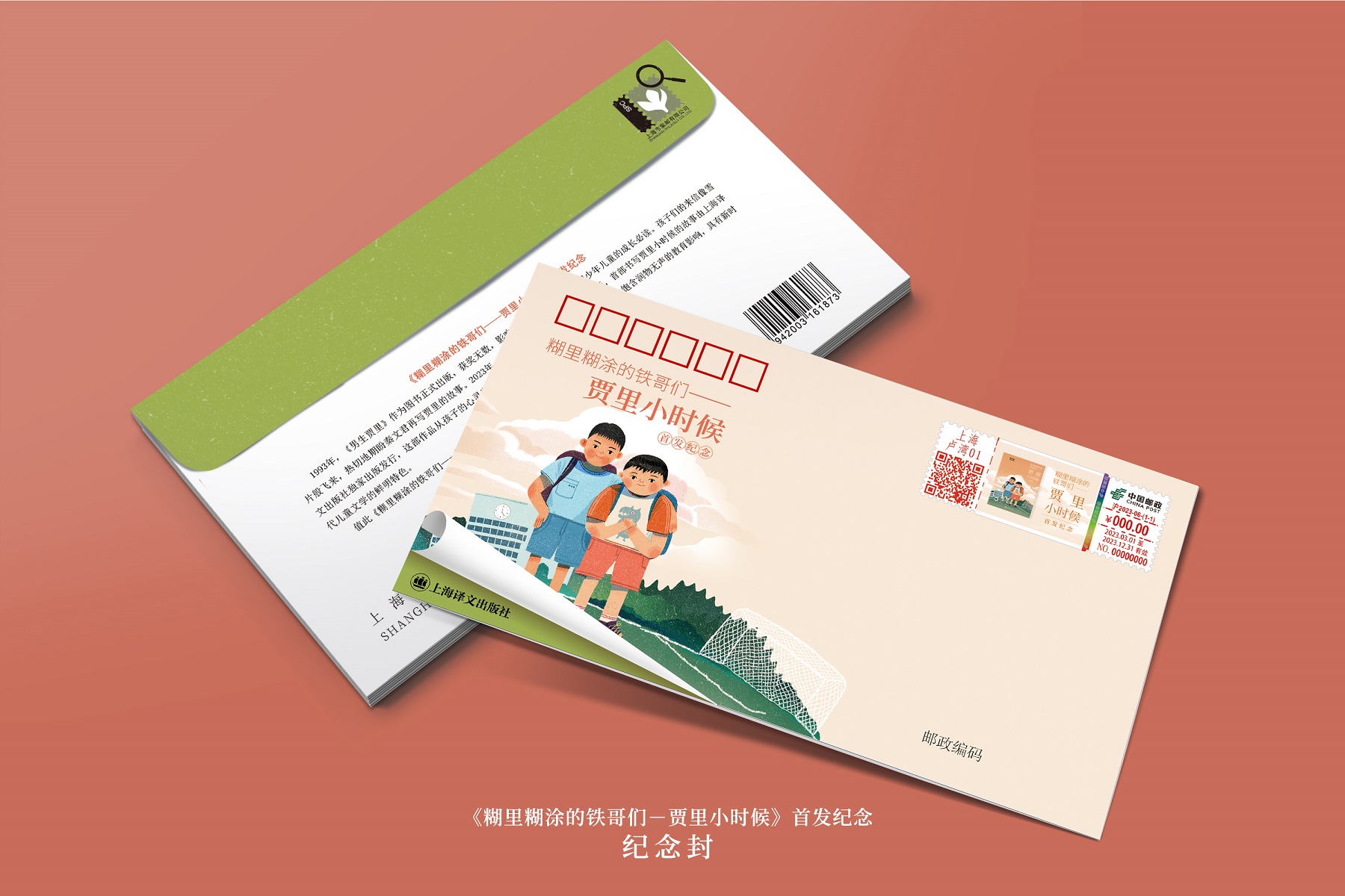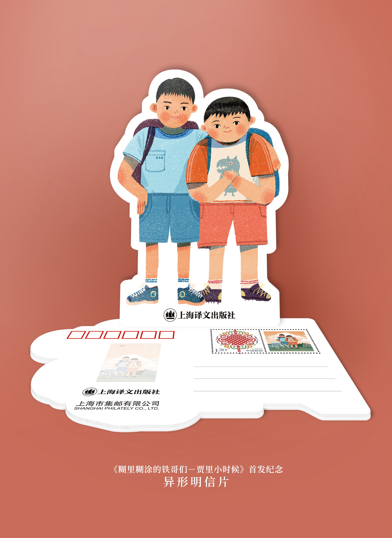 為了鼓勵小讀者們通過書信的方式把最新的閱讀體驗反饋給作家,上海譯文出版社聯合中國郵政共同設計定制了《糊里糊涂的鐵哥們——賈里小時候》紀念郵品——郵票、郵戳、異形明信片和紀念郵封。郵品選用由知名自由插畫師Lisk Feng特別為新書設計的封面插圖為底稿,主要凸顯了小學時期就成為鐵哥們的賈里和魯智勝之間的友誼。