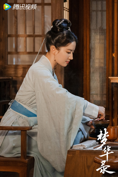 在劇中前期,趙盼兒是錢塘茶鋪的賣茶人,為了體現出市井感,服裝的面料以天青色的棉麻為主,雖清淡樸素,卻恰如其分地隱現了如汝窯顏色的高雅、澄凈,襯托了少女清麗脫俗的氣質。再配上江南水鄉的環境,有種渾然天成的美。而后期趙盼兒經營半遮面茶館時,作為老板娘,服飾則以上下裙款式為主,纖細的皓腕輕搖羅扇,如水雙眸隨之流轉,盡顯婉約柔美之態。