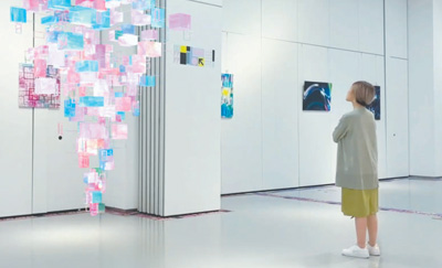 良好的交互體驗,也是數字藝術展聯結觀眾的關鍵紐帶。數字藝術不同于玻璃框里的畫作、展柜里的文物,它可觸、可感、可變,可以充分調動觀眾的好奇心與參與性。在天津濱海美術館“被隱藏的藝術——AR數字藝術展”上,觀眾打開平板電腦掃描展墻上的平面繪畫,立體星云、全息影像等便會“一躍而出”,在平板電腦中生成一件與平面繪畫有一定關聯度的全新數字藝術作品。平面繪畫與數字藝術的有機結合,在帶來趣味體驗的同時,為觀眾打開作品“隱藏”的另一個空間,使其獲得新的美學視角和思考維度。在首屆上海數字藝術國際博覽會上,還有不少作品應用人機交互技術表達藝術觀念,吸引觀眾參與創作,使觀眾成為作品的一部分,或者根據藝術大師的風格生成新的平面繪畫,為藝術創作帶來更多可能。數字藝術的交互性,讓高雅的中國畫、前衛的抽象畫不再曲高和寡,使藝術傳播模式從單向信息輸出轉變為雙向溝通交流,豐富了作品的生命力。