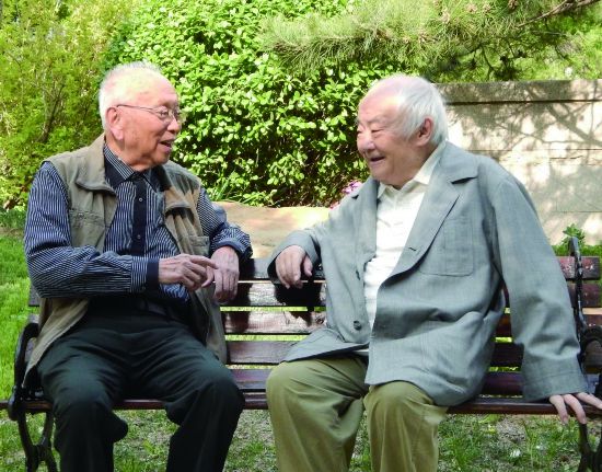 兩位先生坐在燕園·泰康之家園區的長椅上,展開關于童年的暢談,攝于2022年5月。
