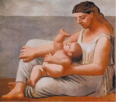 在畢加索藝術人生的“新古典主義”時期,他創作了大量擁有具象特征與古典美感的形象,其中以妻子奧爾加為藍本的畫作尤為出色。創作于1921年的《母與子》(見圖,李笑男供圖)描繪了畢加索的妻子與兒子,畫中人物具有豐沛的體量感,淡淡的藍色與白色色調突出人物溫暖的身體。在構圖上,古典藝術中的水平與垂直關系占據主導,賦予作品古典的質樸與簡潔。畫面背景僅由3個色帶組成,暗示了天空、海洋和未來,與母親形象的幾何形態形成溫柔共振。母親的姿態加強了水平方向構圖帶來的平衡感與秩序性,孩子活潑天真、自然擺動的小腿則賦予寧靜莊嚴的畫面以動感。