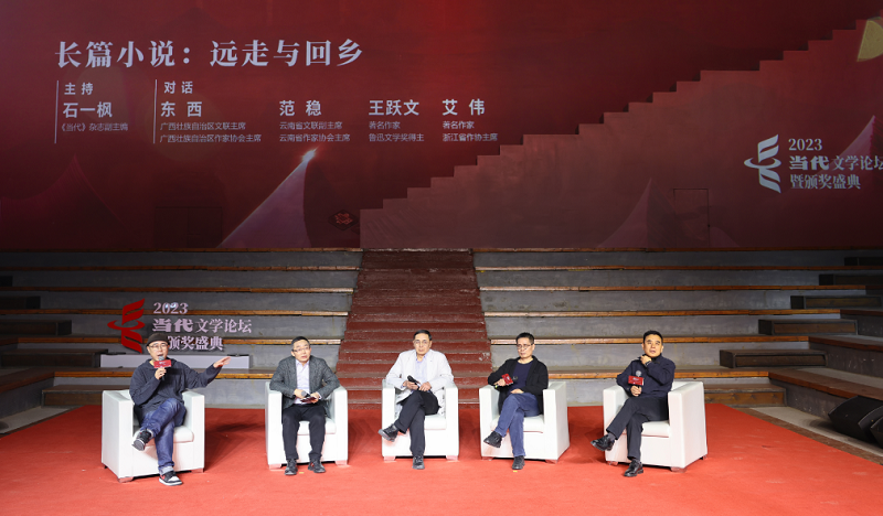 現場還進行了小說家高峰對談,由《當代》副主編、作家石一楓主持,獲獎作家王躍文、艾偉與擔任頒獎嘉賓的往屆獲獎者東西、范穩圍繞“長篇小說:遠走與回鄉”的主題進行了交流。