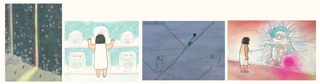 不同于傳統意義上雪孩子的形象,《冰房子》中的雪孩子剛出生沒多久就遭遇了融化危機。雪孩子并不代表新生,代表的是易碎的夢和難以實現的理想。雪孩子可以是世上任何想要守護的、珍貴的存在。人們都希望自己所珍視的雪孩子能永遠活下去,但這種美好的希冀真的能達成嗎?安寧達曾在采訪中解釋自己所畫的兩個主要意象——冰房子與空房子:“女人跑向城市的時候,有很多只剩下門的空房子。我畫那些房子的時候,是想到了隨著時間的流逝,遠離整個社會而逐漸變得邊緣化的少數人群,他們最終被叫作‘城市’的主流社會體系吸收,那些空房子就是不同類型的少數人群留下的痕跡。他們沒有守護住自己的東西,被主流社會吸收,只留下一扇扇門的痕跡。當我畫出空房子的時候,我看著那一扇扇門,仿佛在看一座座墓碑?!?/p>