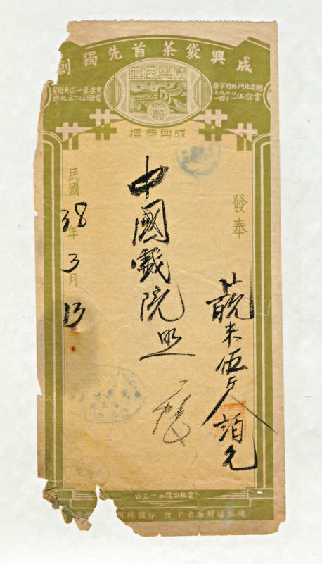 繼此之后,袋裝茶開始風行。新中國成立之后,像中國茶葉公司、北京市供銷合作總社、北京市茶葉加工廠都還生產小袋茶。其實不只是茶,成興小袋茶出現后,其他袋裝商品如袋色、袋煙、袋糖也相繼上市,數十年來其道不衰。這些追源溯流,得說是成興茶莊首開其端。這也難怪當年成興茶莊的發奉(即發票)上,票首一定要印有“成興袋茶首先獨創”八個大字。