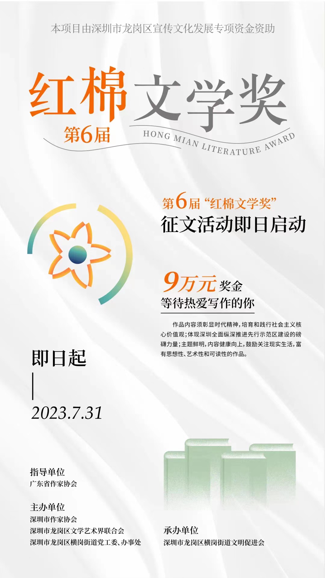 為深入學習貫徹黨的二十大精神,助推新時代文學高質量發展,講好中國故事、傳播好中國聲音,展現可信、可愛、可敬的中國形象。彰顯深圳先行示范作用,弘揚社會主義核心價值觀,發現推介當下原創文學精品力作,第六屆 “紅棉文學獎”征文活動即日啟動。