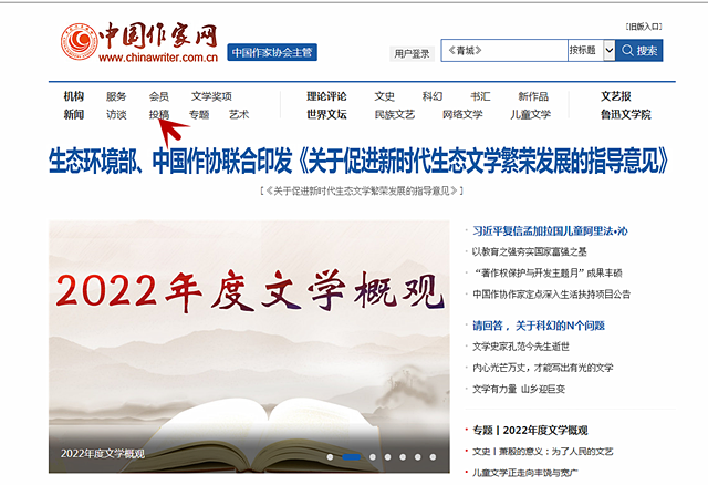 1、首先登錄中國作家網http://www.rjjlock.com/ 在首頁頂端頻道分類位置找到“投稿”(標紅色箭頭處),點擊進入原創頻道。