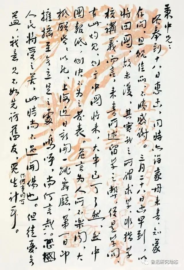 今日閱報,驚悉先生逝世,雖是在辦公室中,不禁伏案慟哭。秉中之得有今日,皆先生之賜。十年來奔走不寧,未能償侍先生講學之志,誠可痛心。然平日對人處事,一體先生真誠態度,不敢有辱先生,此敢告我先生在天之靈者也。海嬰弟方數歲,教養之責,全在師母。伏望節哀,毋損尊體,以肩巨任?;厮记叭赵跍?,先生云“病中亦不能停筆休養,因停筆不單醫藥遂停,即飯亦不得吃也”。痛哉此言,秉中返京二十余日來,晨夕耳中皆如聞先生此言,然又束手無策,不能有所奉助。時時懷念先生病體,而俗務累人,竟未能奉書問候,而今竟成終天之憾事。前次先生面允書數字見賜,病中當尚未書就,敢請師母覓先生所書物事賜寄,以存手澤。