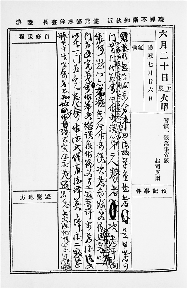 黎明起,食后乘人力車至法政學堂赴考。是日考四門,余卷為戊字十三號。首門代數,題八,甚易,至二次方程止,余全作未誤,為第二人交卷者。次考平面幾何,題八,亦不難,余全作未誤。次考希臘史、羅馬史,題各六,以作一門為完卷,余作希史,微誤;復作羅史,末二題未詳。末考德法文,以作一門為完卷,余作德文,僅有德譯英、英譯德二題,甚難,其中生字余多不知,故此作殊不完全,交卷。返,略息。上火。溫物理、化學等,甚暑乃睡。