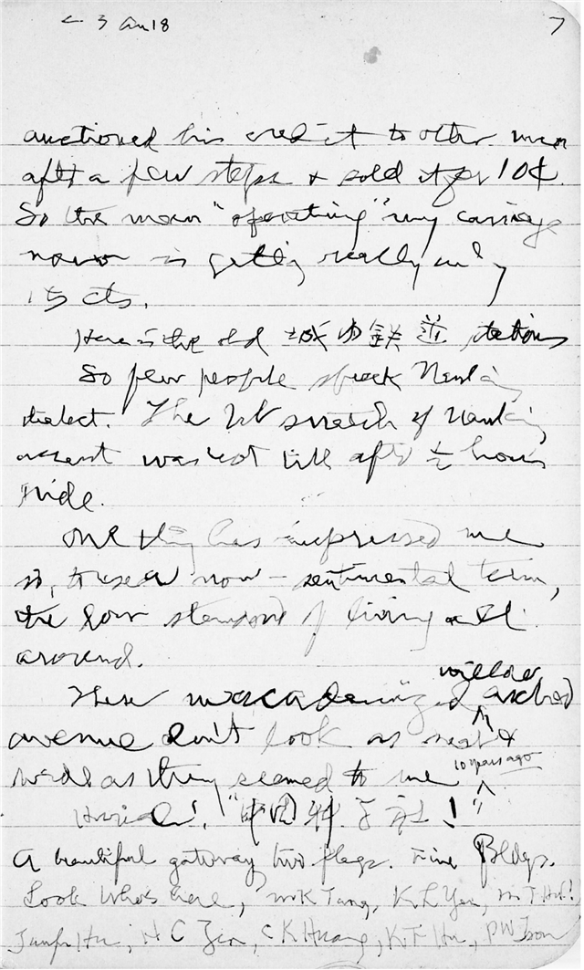 Hurrah!“中國科學社!”A beautiful gateway, two flags. Fine Bldgs. Look, who's here? MK Tang,KL Yin, MT Hu! Tunfu Hu, HC Zen, CK Huang, KF Hu, PW Tsou, MC Hu, CC Chu, C Yang, STWang, CL Lan. Is the convention over? No, your paper is scheduled for tomorrow.好哇!“中國科學社!”美麗的大門,兩面旗幟,漂亮的樓房,瞧!都是誰在這兒,MK Tang, KL Yin, 胡明復!胡敦復,任鴻雋,CK Huang,胡剛復,鄒秉文,MC Hu,竺可楨,楊銓,ST Wang, CL Lan?!皶h結束了嗎?”“沒有,你的論文在明天宣讀?!保ū径巫R讀及翻譯由趙新那女士完成,第9冊內文的英文識讀均由趙新那女士完成。)