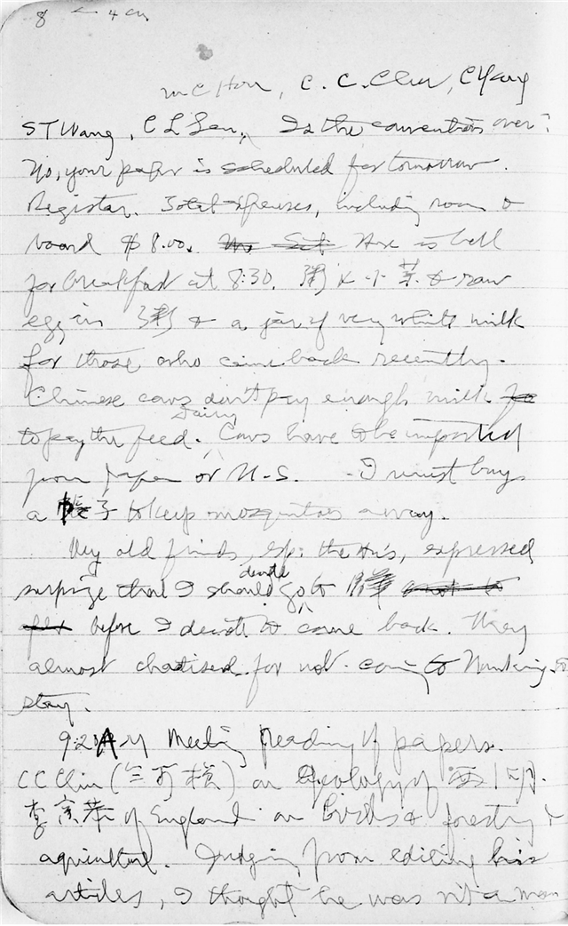《趙元任日記》第9冊內文,記錄趙元任結束留學回國,1920年8月18日在南京中國科學社見到眾多好友。之后的幾日在南京參加科學院第五次年會。本頁及下頁日記選譯 :