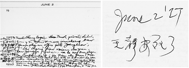 《趙元任日記》第12冊內文,1927年6月2日晚,趙元任得到王國維的死訊,以及日記本中加的紙條