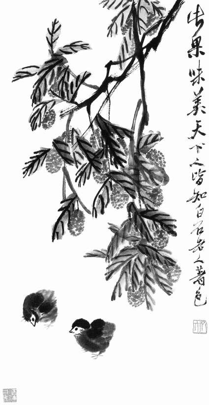 近代畫家齊白石也常畫荔枝,曾云:“牡丹為花之王,荔枝為果之王,白菜為菜之王”,由此可以看出齊白石對荔枝的偏愛。齊白石還寫有《荔枝詩》:“丹砂點上溪藤紙,香滿筠籃清露滋。果類自當推第一,世間尤有昔人知?!饼R白石晚年的荔枝畫用色艷麗,筆力雄健,形成鮮明的個人風格。他繪有一幅《荔枝小雞》。畫面中,幾枝成熟的荔枝從右上角傾斜而下,占據畫面主體,兩只毛茸茸的小雞站立在荔枝果下,惦念著空中鮮艷可口的美食。畫家用干筆重墨寫出荔枝主干,用筆蒼厚古樸,有篆書筆意。畫樹葉時,畫家毛筆筆肚上水分較多,寫出來的葉片含水量較大,水分和色彩融合氤氳,使得葉子生機勃勃、翠綠欲滴。鮮艷的荔枝果實掩映在樹葉下,像是一位位含羞的美人。兩只小雞身上的墨色變化豐富,淡墨在宣紙上洇開的痕跡恰似小雞的絨毛。畫家寥寥數筆勾勒出小雞的身體結構,生動傳神。