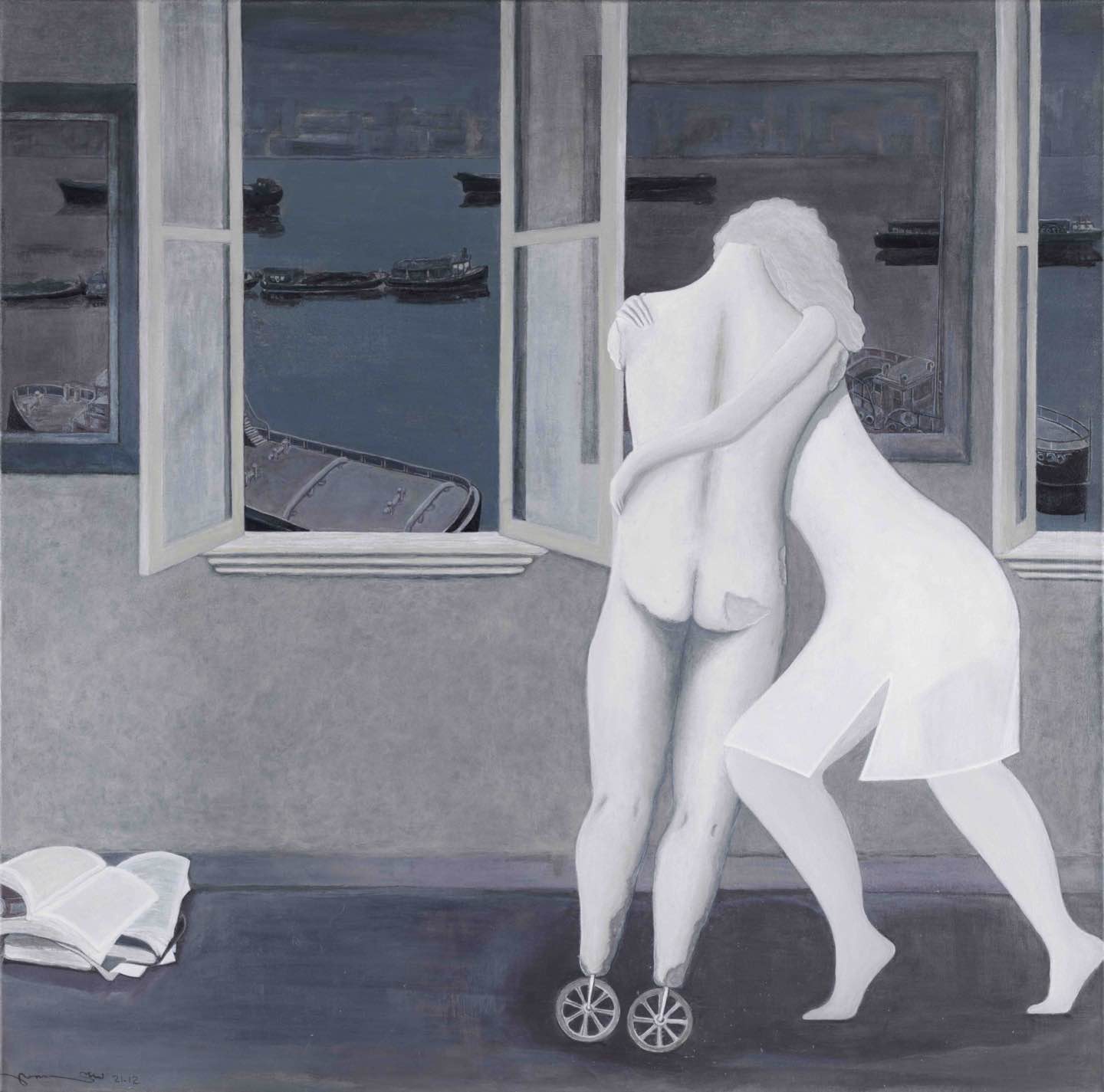《北風》為俯瞰上海大廈背面那整幅街景,與一般表現不同,體現鱗次櫛比的城市魅力,是在黑白灰的配色中,亦真亦幻,意味異常繁復,屏風式的三聯畫,沒有光影,幾乎都是平面,卻也很立體。白雪覆蓋的城市顯現一種童話式的不真實、不對應的恍惚感,安靜的車道,兩旁店面和樓房,仿佛都在夢中?!澳敲炊嗟膮柡θ宋?,都會來到這座城市,上海是個大染缸,是真的,只要他來這里生活,就會染上它的特征,畫中的每一棟樓,每座公寓,每扇窗戶背后,在發生著一些什么,你知不知道?你不知道?!辈恢赖氖?,最有意思。