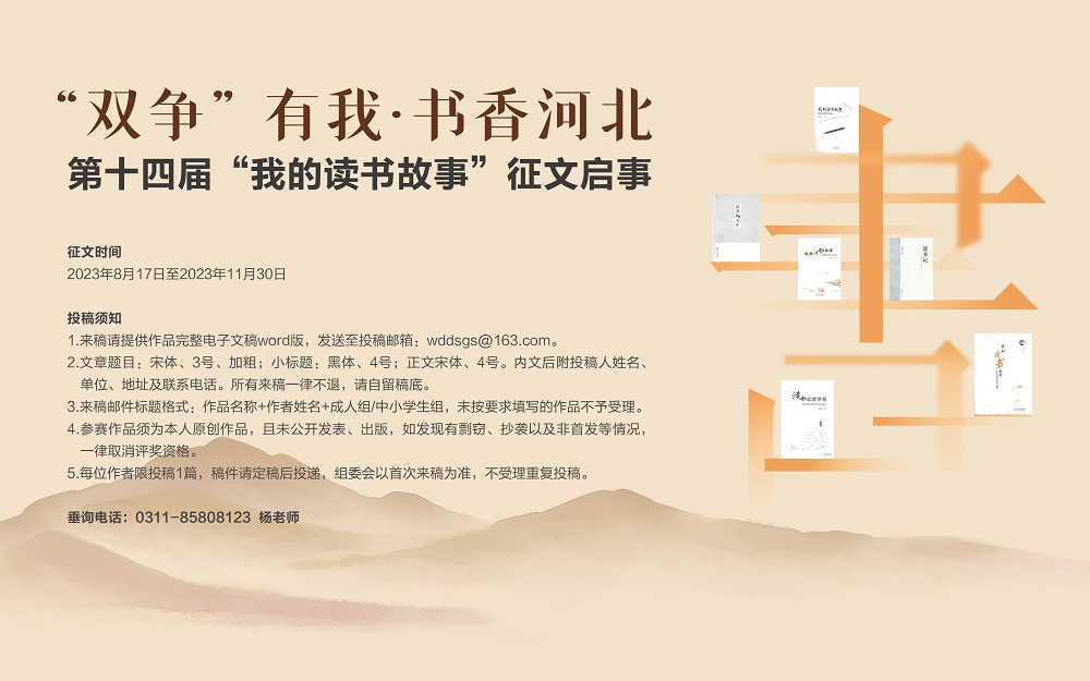 為推動全民閱讀,營造“雙爭”有我·書香河北濃厚氛圍,河北省作家協會、河北日報報業集團聯合舉辦第十四屆“我的讀書故事”征文活動。愿讀書滋養智慧心靈,開啟人生夢想,點亮美好生活,請您拿起筆來,寫下獨屬于您的讀書故事。