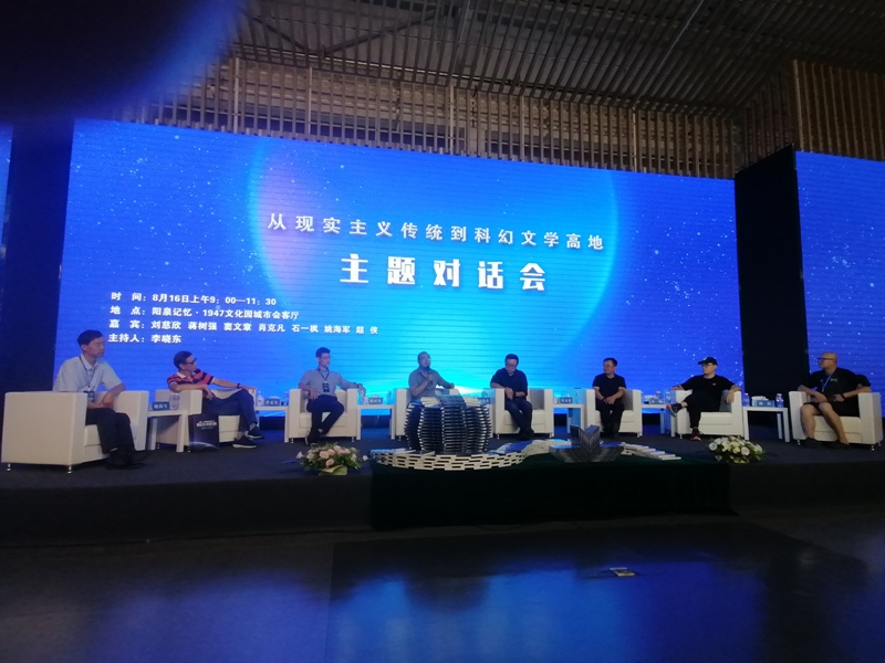 肖克凡、石一楓、姚海軍、超俠、楊遙等作家以及蔣述強、竇文章等科學家與劉慈欣對話、交流對現實主義和科幻文學的體會與見解?;顒佑芍袊鲄f社聯部主任李曉東主持。