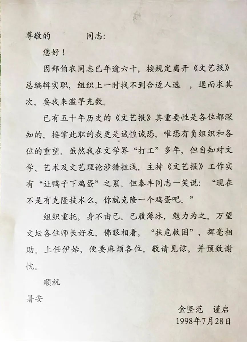 1998年7月初,鄙人接任《文藝報》總編輯。約稿難,是當時面臨的眾多困難之一。一位編輯對我說,打電話給作家、評論家約稿,有些人說不給你們寫稿。為打開局面,我寫了一封約稿信,打印了200多份,寄發給全國各地的作家、評論家,請他們支持——