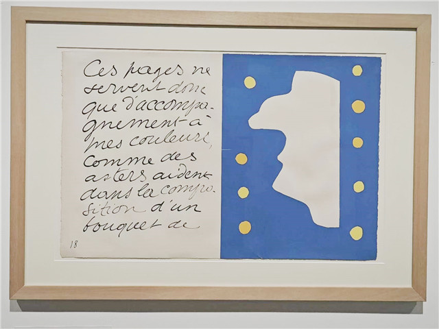 經常有人將剪紙誤讀為 72歲的馬蒂斯因疾病纏身、無法再提筆繪畫的權宜之計。事實上,藝術家在裁剪造型、構圖與定稿過程中體現了對自我和作品近乎嚴苛的要求。展陳中可見大量的剪紙作品及運用此方法創作的藝術書(其中最著名的是于1947年9月出版的《爵士》)、戲劇舞臺設計、壁畫、紡織物、彩色玻璃花窗等衍生作品,通過事實糾正了可能發生的誤讀。