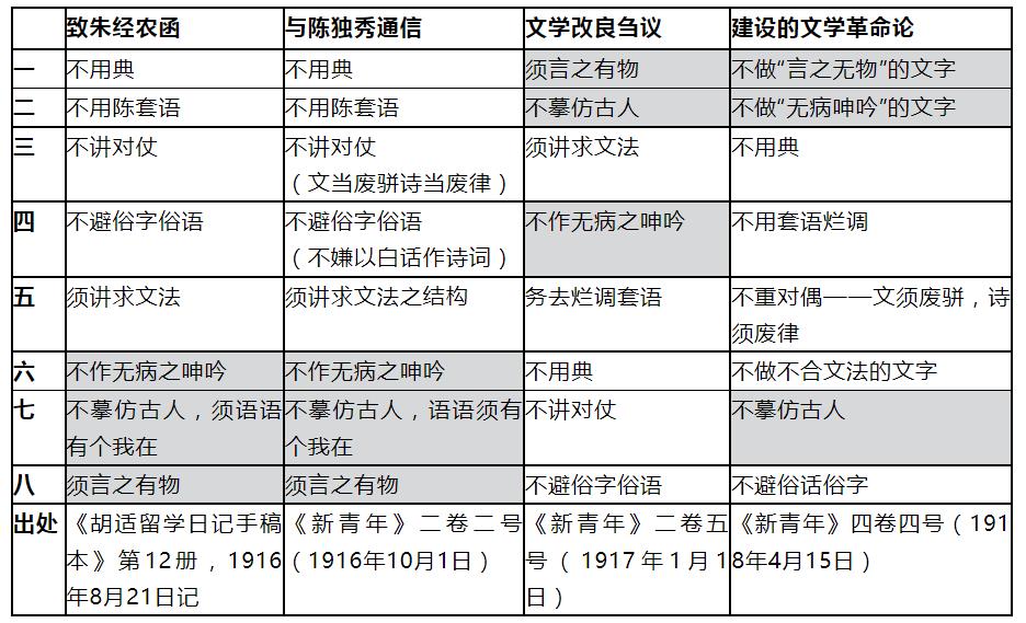 胡適在《新青年》上發表《文學改良芻議》,一向被敘述為文學革命的起點,其中最為核心的就是“八事”。有關“八事”,胡適前后有好幾個版本。按他自己的說法,最早于1916年8月19日給朱經農的函件中提出,[5]隨即10月的《新青年》第二卷第二號上刊載他給陳獨秀的“通信”,也有同一版本的“八事”,只是稍多些附注。估算郵寄到刊發的時間,應寫于給朱經農信后不幾天。接著就是《文學改良芻議》上的版本,內容未變,順序卻進行了很大的調整。到《建設的文學革命論》,除又有順序調整外,為了映照新提出“肯定的口氣”的“四條”,“八事”均改寫為以“不”開頭的句式。為清眉目,茲先簡表如次:
