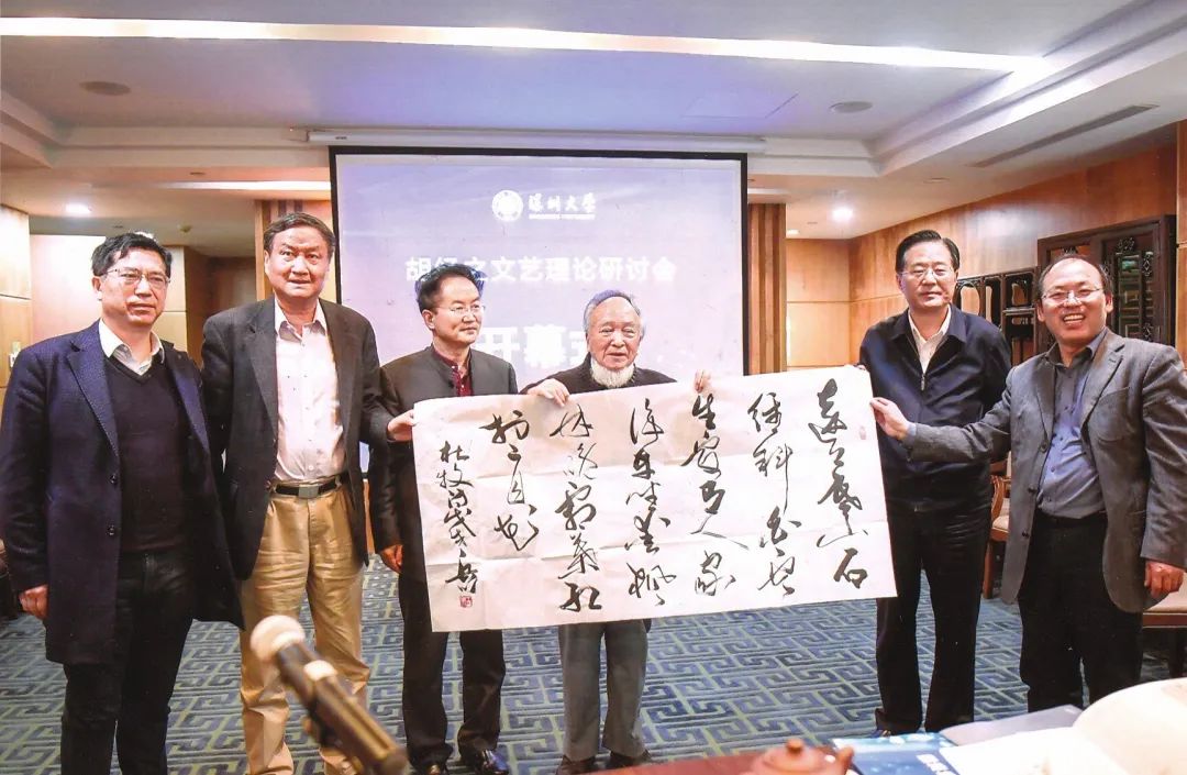 2018年,深圳舉辦《胡經之文藝理論》研討會師生重聚,王岳川獻上“文化書法”。從左至右依次為:王列生、王坤、王岳川、胡經之、張首映、李?。ū疚淖髡撸?/span>