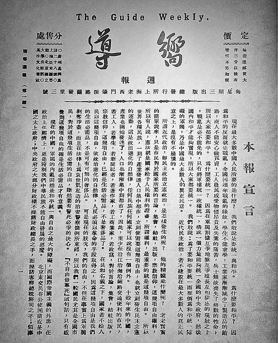 1922年9月13日,《向導》周報在上海創刊,每星期三出版,十六開四版,以政論、時評為主。1923年,黨中央對黨團報刊進行分工,規定《新青年》季刊是“學理的馬克思主義的研究宣傳機關”,《前鋒》月刊是“中國及世界的政治經濟的研究宣傳機關”,《向導》是“國內外時事的批評宣傳機關”。1923年11月,中共中央在一份報告中指出,在黨所創辦的《前鋒》月刊、《新青年》季刊和《向導》周報三種刊物中,“《向導》在社會上稍有影響”。