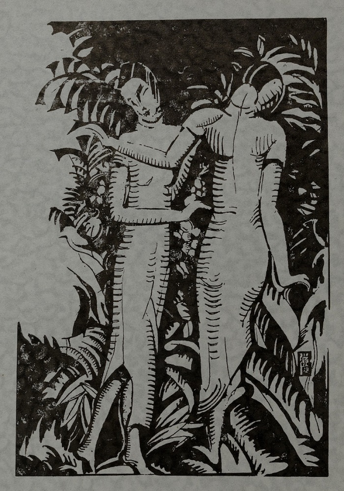在“生活”欄前的畫,是兩位穿旗袍的女子在森林里游玩。畫面左側女子的手臂搭在右側女子肩上,頭微側,赤足,雙足提起,似在舞蹈,似在走路;右側女子的臉似是給樹葉擋住了,或者戴著面具,很有神秘感,身形婀娜多姿。兩位女子手互相搭在肩頭,四周有很多樹葉、花朵、果實圍繞。林徽因的簽名位于該畫右下方,署名“徽因”。