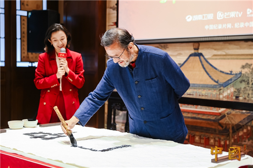 中國藝術研究院原院長連輯現場揮筆撰寫“中國”二字,與到場嘉賓共創五彩長卷, 預?!吨袊返谌鹃_播。