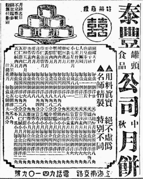 南京路五一四號泰豐餅干公司,向售各式餅干,應時點食,以及各種罐頭食物,每年在中秋佳節,特制應節各種月餅,今屆定八月一日正式上市,連日將櫉窗以及內部結彩裝燈,左右二大門窗并扮戲劇二出,右為古城相會,左為貂蟬拜月,點綴殊佳。經理王君拔如因公司營業較往年尤盛,且鑒于去年中秋顧客有應接不暇之勢,為此于兩月前特筑新式大爐灶一座,并添聘名司,專制月餅,故今年月餅花色極多,售價由二角起至二十元止,其名目有六十一種(統計標號有誤,事實上有六十二種)如左:
