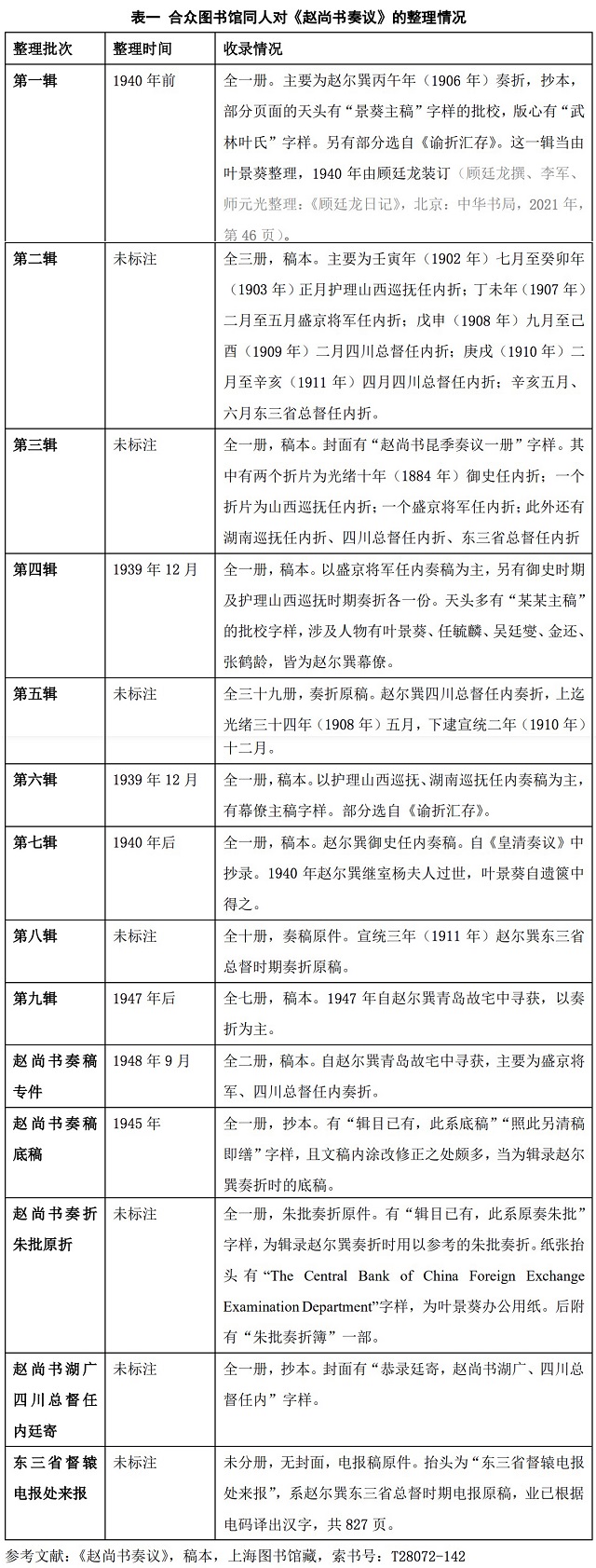 在“趙爾巽遺稿”中,體量最為龐大者為《趙尚書奏議》。因是,葉景葵等合眾圖書館同人先后多次對這批文獻進行整理,其情況見下表: