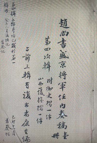 在圖書館同人整理《趙尚書奏議》之初,或許是因為文書體量過于龐大,很快便出現了重復整理、重復收錄的差錯。1939年12月,葉景葵在《趙尚書奏議》稿本第四輯的封面上批注云:“《趙尚書盛京將軍任內奏稿》一冊。第四次輯。附御史折一件、山西護撫折一件。與前三輯有重出者,應重編”(柳和城編著:《葉景葵年譜長編》,上海:上海交通大學出版社,2017年,第960頁)。關于第四輯所收文獻,葉景葵復于1944年再次批注云:“第四輯各折片均已載于第一輯內”(葉景葵:《趙尚書奏議第四次輯錄題識》,葉景葵撰、柳和城編:《葉景葵文集》中冊,第944頁)。上述批注應當是葉景葵在整理趙遺稿時的備忘,提示第四輯主要為“趙尚書盛京將軍任內奏稿”,與第三輯存在內容重復的情況,且第四輯所收折片與第一輯近乎相同。由此一例可以想見,在合眾圖書館同人分批整理《趙尚書奏議》時,各輯所收文獻存在重復的情況,葉景葵在1940年代初即意識到該問題。