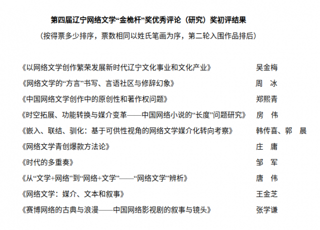 第四屆遼寧網絡文學“金桅桿”獎優秀評論(研究)獎初評工作于2023年10月8日結束。根據《遼寧網絡文學“金桅桿”獎評獎辦法》,經初評委員會評委認真審讀和充分討論,投票產生了10篇(部)入圍論文(論著),現予公示,公示期從10月9日至10月13日。此期間如對入圍作品存有疑議,請向評獎紀律監督組(省作協機關紀委)反映。