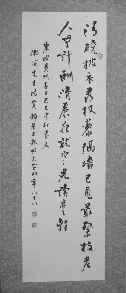 最令我喜出望外的是,1989年秋,臺先生主動為我題寫了一個條幅,題為蘇東坡七律《黃州春日雜書四絕之一》:“清曉披衣尋杖藜,隔墻已見最繁枝。老人無計酬清麗,猶就寒光讀《楚辭》?!秉S州即當下的湖北省黃岡。1079年,蘇東坡因政治冤案被放逐黃州,整整呆了四年。繁花似錦的春晨原是清麗美好的,但蘇東坡心情郁結,沒有辦法欣賞,只能在冰寒交加的心境中讀《楚辭》以抒憤懣。臺先生退休后,開過書法展,作品有潤格,一搶而空,我當然不會隨便開口索字。事后深思,他特題寫蘇東坡的這首七律,我認為是他想讓我及他在大陸的老友了解他在臺灣的心境,有跟蘇東坡被貶黃州的心境相類比的成分。作品選擇了臺先生最擅長的行書。他當年雖已八十八歲,但仍筆力勁健,渾樸老辣,布局舒朗,自然天成,實為書法作品中的佳品。