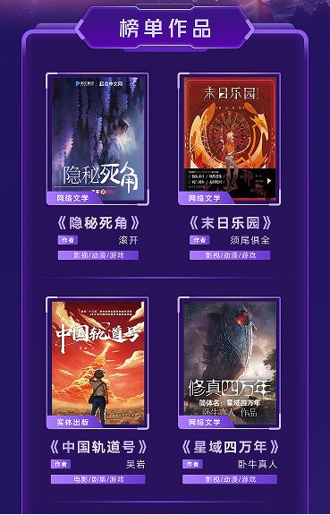 10月19日晚,在2023世界科幻大會上,科幻世界雜志社聯合中國科幻研究院共同發布了《中國科幻文學IP改編價值潛力榜(2023)》(以下簡稱榜單)。榜單旨在為行業提供專業的參考意見,推動中國科幻作品的IP化進程。榜單由科幻導演、編劇張小北做現場發布。本次共有包括《隱秘死角》《末日樂園》《中國軌道號》《星域四萬年》《造神年代》《深淵獨行》在內的12部作品上榜。