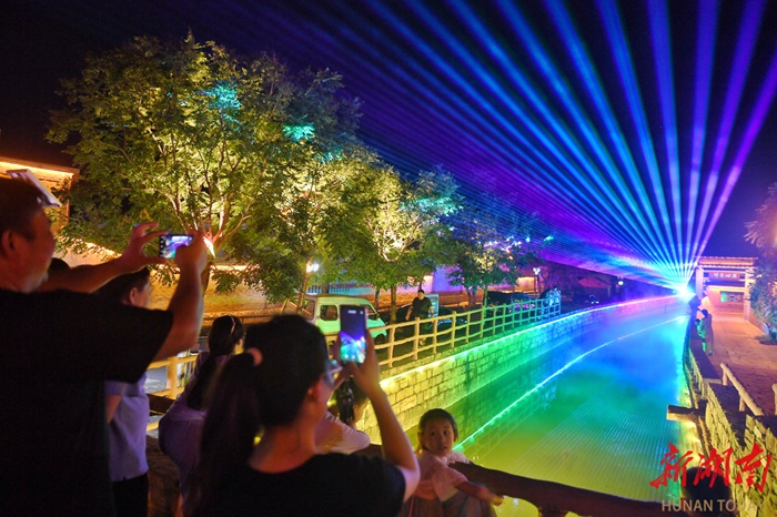 河南省林州市黃華鎮廟荒村,游客在欣賞水上燈光秀。近年,該村圍繞太行山民居特點,打造“渠畔人家”景觀帶,蝶變為遠近聞名的“網紅村”,駛入了鄉村振興的快車道。 湖南日報全媒體記者 徐行 攝