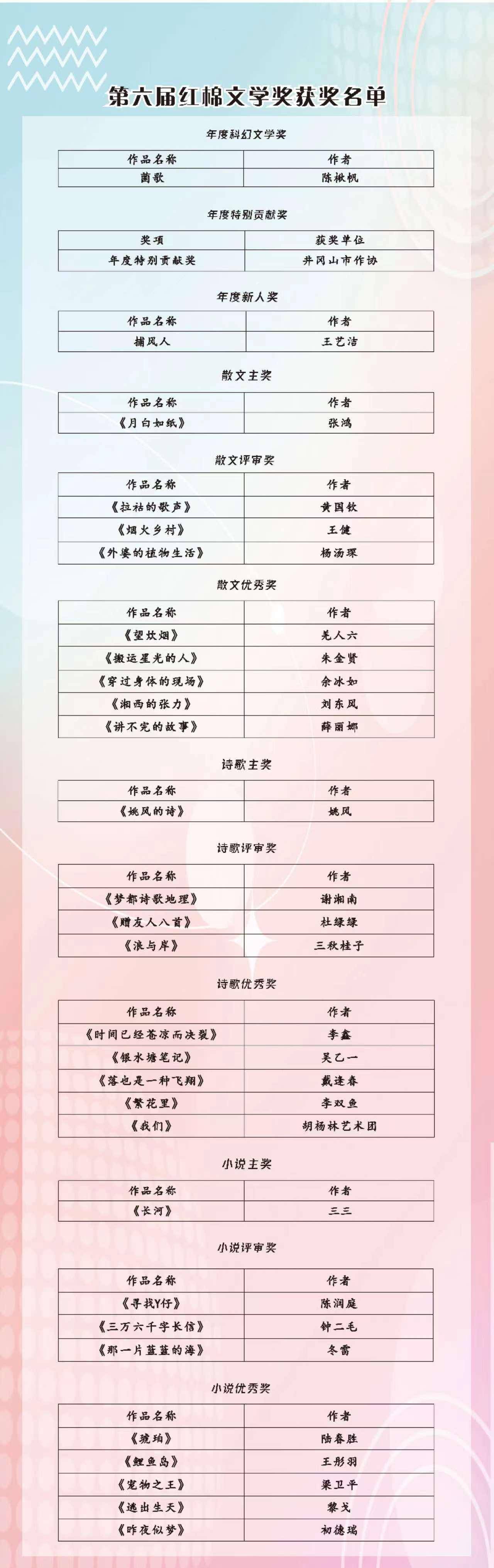 由廣東省作家協會指導,深圳市作家協會,龍崗區文學藝術界聯合會,中共深圳市龍崗區橫崗街道工作委員會、深圳市龍崗區橫崗街道辦事處聯合主辦的第六屆紅棉文學獎,從4月開始面向全國征稿,累計收到來自全國各地參賽作品5600多篇/部,經評審委員會評選,獲獎名單出爐。