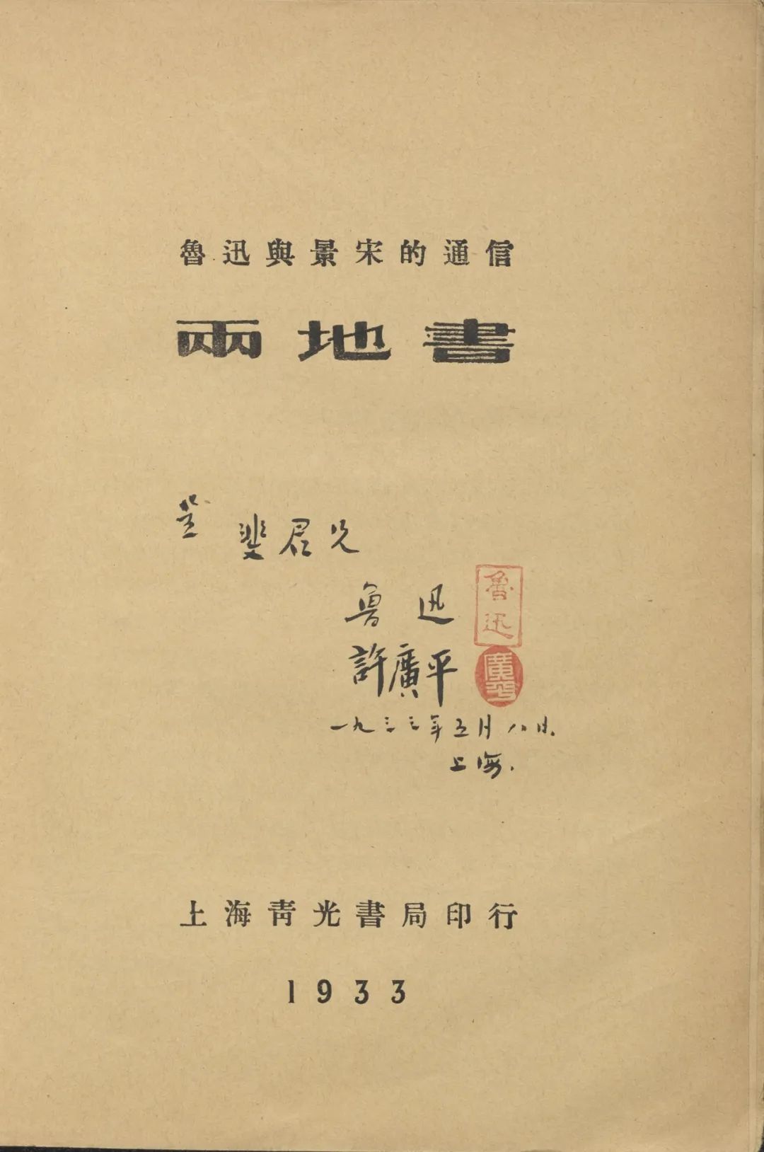 魯迅、許廣平題贈孫斐君《兩地書》扉頁(中國國家圖書館提供)