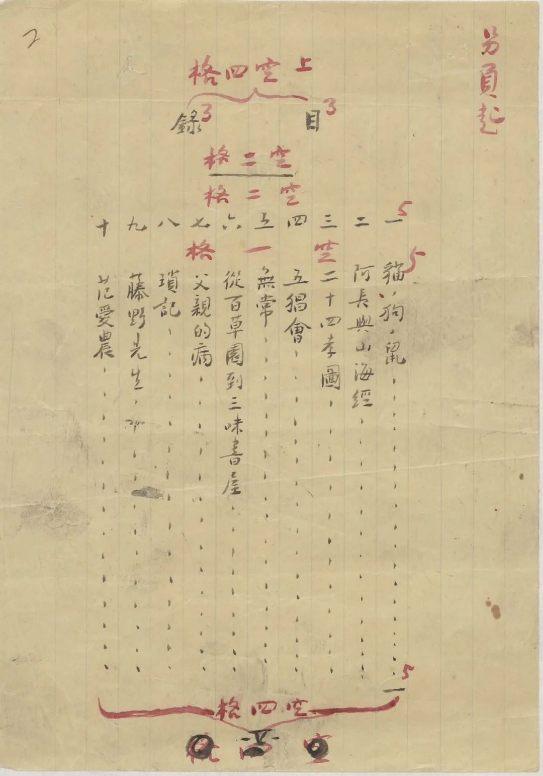 魯迅手稿《朝花夕拾》目錄(中國國家圖書館提供)
