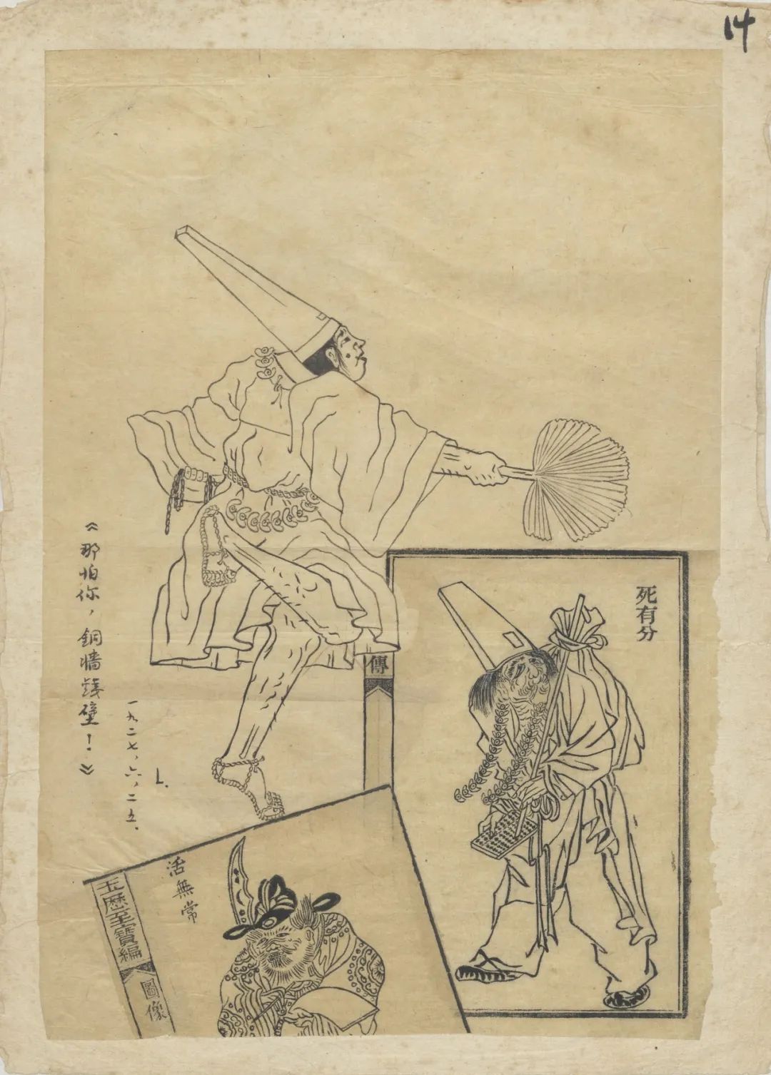 2.《〈朝華夕拾〉后記》:作于1927年7月11日,最初發表于1927年8月10日北京《莽原》半月刊第2卷第15期,署名魯迅?!逗笥洝肥指骞?9葉,文字部分使用“文藝叢書稿紙”,另有4葉插圖,描繪“曹娥投江尋父尸”、老萊子戲彩娛親、玉歷寶鈔等書中的無常圖像,主要是剪貼在白紙上的印刷品,并有少量魯迅手書文字與填描圖案。其中最特別也最珍貴者當數魯迅本人手繪“所記得的目連戲或迎神賽會中的‘活無?!保ㄒ姴鍒D),可窺見作者美術修養之一斑。