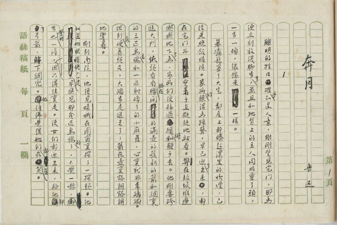 3.《奔月》:完成于1926年12月30日,初刊于1927年1月25日《莽原》半月刊第2卷第2期,收入小說集《故事新編》。手稿共16葉,使用綠格“語絲稿紙”,與其他5種魯迅手稿合訂為一冊。本文手稿修改頗多,墨跡有濃淡之分,能夠反應作者早期創作時大幅修改,初稿、修改稿與定稿合一的創作習慣。本文手稿(見插圖)是國圖藏魯迅手稿中唯一一種小說手稿?!侗荚隆妨碛幸环N用于出版《故事新編》的手稿,藏于上海魯迅紀念館,以《莽原》的發表版本為底本,有少量修改,最重要的一處修改是將落款時間從1926年12月30日改為1926年12月。