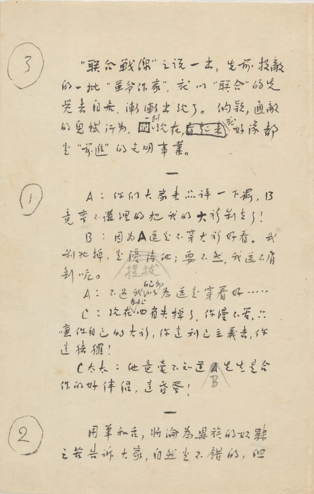 4.《半夏小集》:約寫于1936年8月或9月初,發表于1936年10月《作家》月刊第2卷第1期?!鞍胂摹笔侵兴幟?,藥性微毒,以此為題有以毒攻毒之意。與魯迅晚期創作手稿不同,使用普通白紙。據馮雪峰回憶,該文完成初稿后,由魯迅口述修改,馮雪峰執筆改動,再由許廣平謄抄用于發表。本件手稿(見插圖)中墨色較淡的修改字跡出自馮雪峰之手。