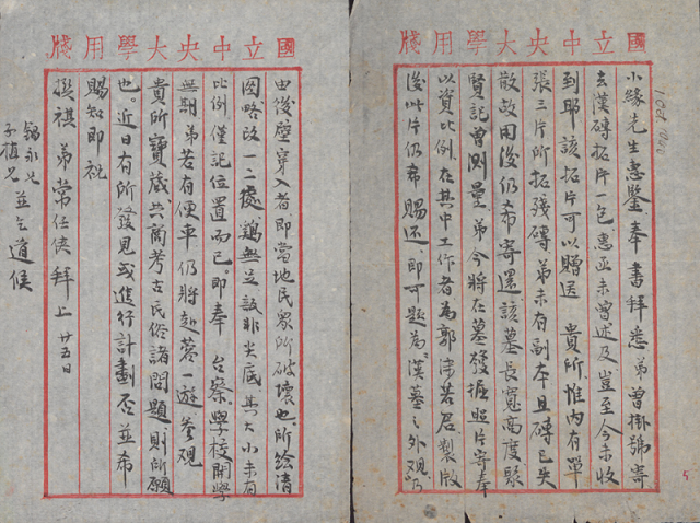 奉教敬悉。前以底稿或不需用,故未奉上,茲再寄呈臺覽并附略歷一紙,并希查收。佘磊霞先生寓址何處,如帶來,敬當往取。漢墓發掘在進行中,已掘三墓,有花紋古墓專[磚]十余種(墓磚甚多,足累一墻)及其他明器。另一山頭尚有八墓完好未動,因工程較大,未敢草率。最好錫永或兄臺能來參加一次,校中小石、靜安先生均曾往工作也。拙稿有成當奉上,勿念。匆此,即祝