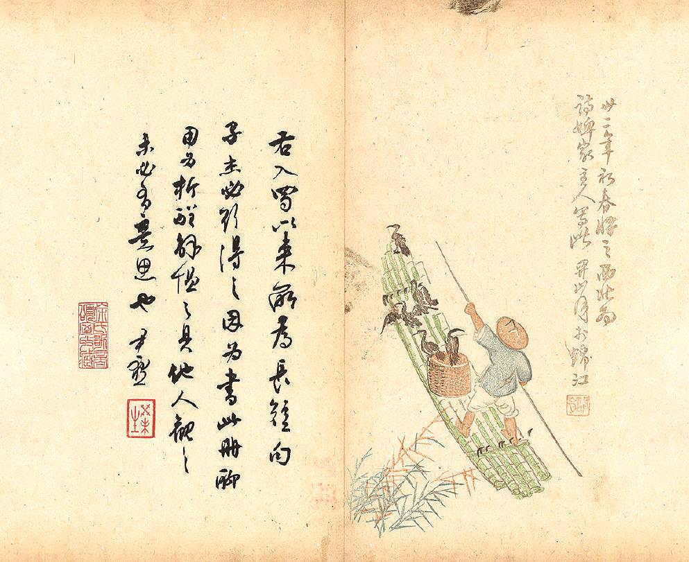 《入蜀詞》所用箋紙為1943年成都詩婢家主人鄭伯英遠求墜緒、近集時珍所制套色木板水印佳品,乃采摭當世蜀中、游蜀或省外諸名家畫事而成者,包括趙熙、余興公、張大千、齊白石、陳師曾、趙望云、黃君璧、關山月、張采芹等,琳瑯滿目,精美紛呈。首版只印五百部,當時即稱難得。所用者有“第二二部”的編號,且編號處及鄭氏箋譜后記署款處均有手鈐的鄭氏名印,余往年見謝無量以同一箋譜所書詩稿一冊則俱無之。今日觀之,彌覺珍貴了。
