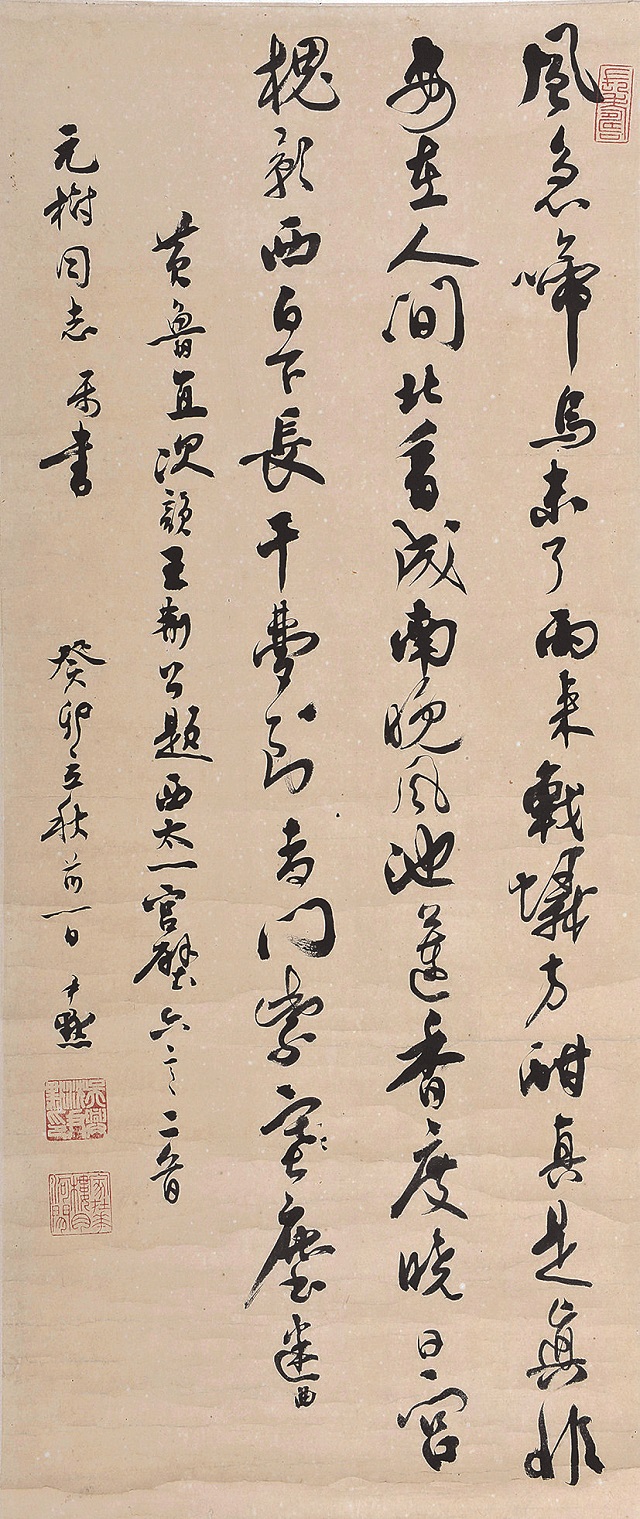 《入蜀詞》書寫的具體時間尚可續考。秋明翁書贈程沈夫婦的《念遠詞》卷首有“值余來成都,出示索為題記,因志其由來如此,癸未嘉平”的題識,知秋明翁于1943年末、1944年初有成都之行(酈千明《沈尹默年譜》失載)。又據劉振宇先生《已見春生處士家——從北京畫院藏南五臺圖看張大千、林思進在成都的藝文交往》(《大匠之門》會議論文集,2021年6月),1944年1月9日,郭子杰在成都福興街全家福餐廳宴請沈尹默、陳寅恪、錢穆、蒙文通、徐中舒等,午宴后觀賞大風堂臨摹敦煌壁畫,張大千親為導覽。郭子杰之索字,或即在此期耶?