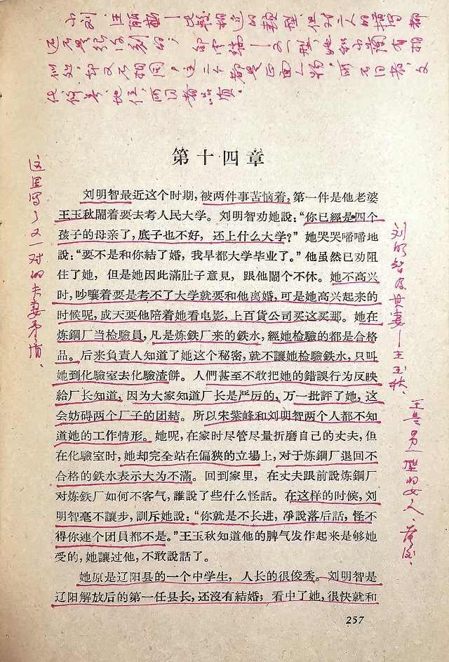 這些較為豐富的批注內容,既有整體性評價,也對細節描寫作了評價。前者如第二十二章尾頁留下了三段批注:“許多人物都給一個圓滿下場——何大姐和列全的婚姻是其中最不必要的一樁。此章內瑣細的敘述,受了舊小說的影響?!薄半x奇曲折的情節過了一定限度就不真實,但尤其重要的是:離奇曲折的情節必須與人物性格的發展相結合,否則就是為曲折而曲折。小蘭和少祥的‘曲折’,從二人的性格發展來看,并不結合得密切的”;“小蘭和少祥的婚姻,正所謂‘好事多磨’,而其基礎在于(一)雙方都不肯先表白自己的心愿,(二)由于第三者的插入所造成的誤會,可是,這兩個因素都不可能造成那樣的‘曲折’;男女雙方的靦腆程度,極像舊社會中封建思想濃厚的少男少女,不大像今天的青年。今天的青年由于自尊性不肯先向對方表示‘遷就’,但不會那樣忍受痛苦而不把問題提出來”。后者如第174頁的批注:“小劉,汪麗斯——比較相近的類型,但對二人的描寫都還不是很深刻的;邵云端——又一型,她和小蘭有相似處,卻又不相同。這二個都是正面人物,所不同者,文化、修養、地位,所同者品質”。