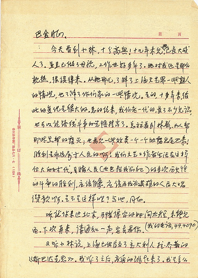 草明和巴金多年未有聯系,這次能夠書信往來,是通過巴金的女兒“小林”才聯系上的。這在草明致巴金第一封信中可以看出:“今天看到小林了,十分高興!”通過草明與小林的相見,才有了草明與巴金的書信往來。巴金的回信因草明的來信中沒有寫明通信地址,遲遲未回復,通過小林才給草明回復了此信。書信內容將巴金對草明的問候、感謝、無法早寫回信的緣由等說得清清楚楚。