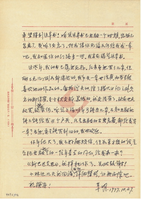 相較于第一封書信,第二封書信是一封字數簡短的書信,但內容卻很豐富:信中提到了對巴金的贈書表示感謝;從《光明日報》上看見巴金近照,關注巴金的近況;希望巴金的譯作早日問世;對巴金的祝福;字里行間能夠體會到老一輩作家間的深厚友誼。
