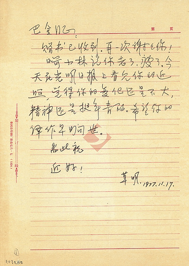 中國現代文學館的書信庫中珍藏著草明致巴金書信兩封,它們分別寫于1977年10月27日和1977年11月17日。從書信時間、內容來看,顯然是草明寫給巴金的具有連續性的兩封書信,且兩封書信之間有巴金的回信一封。