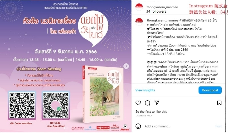 本次活動及作品推介的消息在泰國報紙《京華日報》、《亞洲日報》,并通過南美書局的臉書、影格等社交媒體賬號發布,經由泰國漢語教師、學者等積極轉載,覆蓋泰國讀者約35萬人。