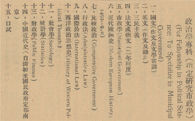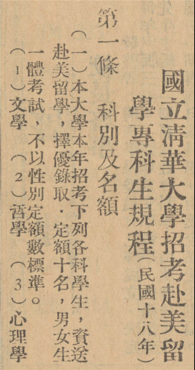 一九二九年清華留美考試政治科專門和總平均成績最高的是張歆海之弟張企泰,因國文作文不及格未能錄取,后到巴黎大學改學法律。文學科遺憾落榜的陶燠民也到巴黎留學,一九三四年病逝異鄉。周纘武則選擇進入清華新辦的外文研究所深造。清華開辦大學本科的同時開辦了研究院國學門,一九二九年秋起,又陸續開設各系研究所,招收全國大學畢業生,本校優秀畢業生免試入讀。一九三〇年,清華決定不再舉辦留美??瓶荚?,將經費用于擴充研究院。在研究院兩年以上、有特殊成績可派遣留學。一九三三至一九三七年,清華共選派十六名研究院畢業生留學歐美。