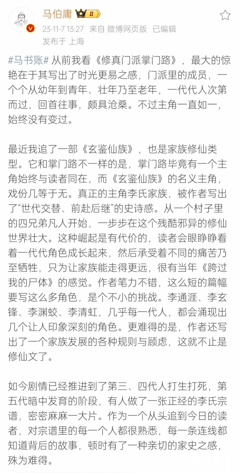 著名作家馬伯庸也是《玄鑒仙族》的讀者,對《玄鑒仙族》的群像寫法拍案驚贊。他認為,書中的李氏家族被作者寫出了“世代交替、前赴后繼”的史詩感?!皬囊粋€村子里的四兄弟凡人開始,一步步在這個殘酷邪異的修仙世界壯大。這種崛起是有代價的,讀者會眼睜睜看著一代代角色成長起來,然后承受著不同的痛苦乃至犧牲,只為讓家族走得更遠?!?/p>